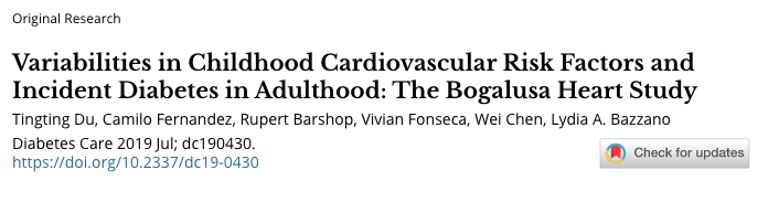 因此今天分享的这项研究,即Bogulusa Heart Study,是一项通过对儿童时期心血管危险因素的监测,试图了解心血管疾病自然病程的研究,这为研究者观察儿童时期CVRF的变异性(不存在混杂风险因素或合并症)与成年后的糖尿病风险的关联提供了一个绝佳机会。