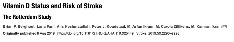 RS研究(Rotterdam Study),是一项基于人群的前瞻性研究,测量了9680名年龄≥45岁的参与者(56.8%为女性)在1997年至2008年间的血清25-羟基维生素D浓度,调查了基线期卒中患病(prevalent stroke)情况,以及随访到2016年1月1日,观察到的卒中新发(incident stroke)情况。
