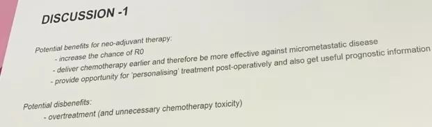 术前接受治疗组有较低的pT等级(pT为病理分型)(pT0-pT2 rate 18% vs 8%, p < 0.0001),较低的pN等级(pN0 rate 64% vs. 52%, p = 0.0002)和较小的肿瘤半径(40mm vs. 51mm, p < 0.0001),较高的R0等级(99% vs. 96%, p = 0.02)。