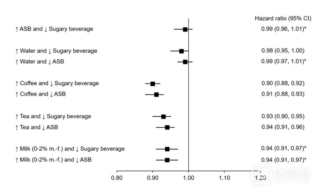 图2:甜味饮料摄入量的改变及被其他非甜味饮料替代后的2型糖尿病发生风险(HR)