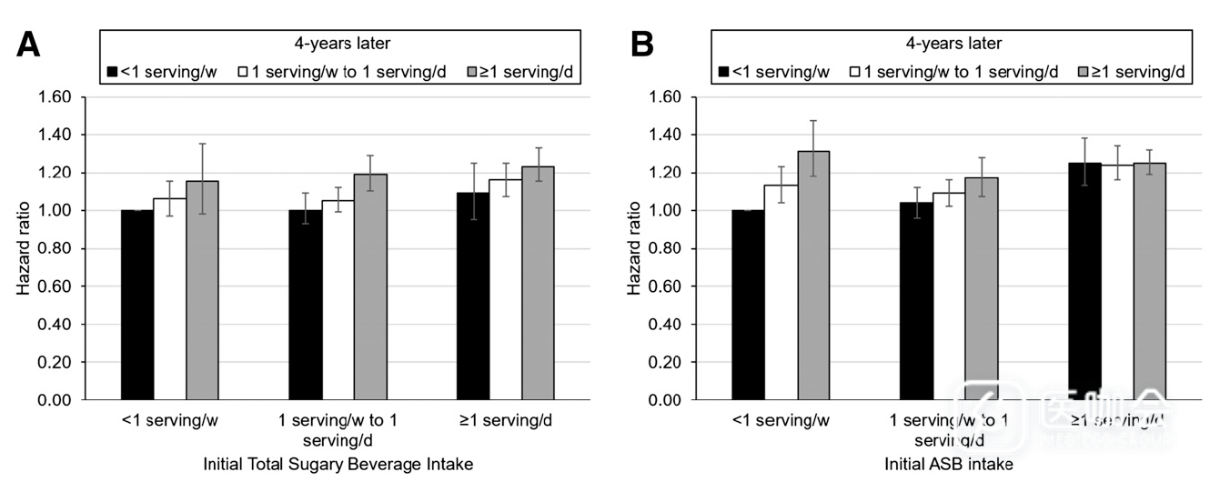 图1:根据基线及4年后总甜味饮料(A)和人工甜味饮料(B)摄入量分组的2型糖尿病发生风险(HR)