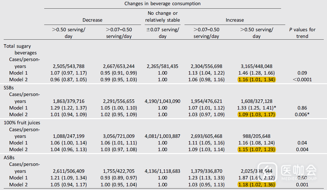 以甜味饮料摄入量不变组作为参考,在校正了BMI、基线和4年中饮食及生活方式变量后显示:
