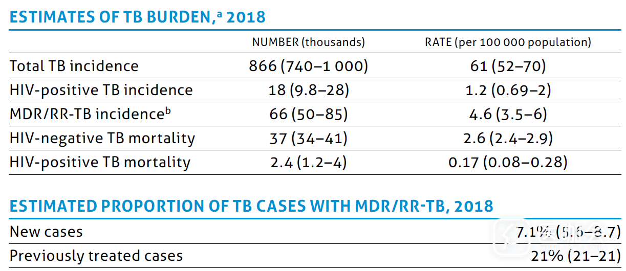 2018年,全球估计约有48.4万人为新发的耐利福平结核病(RR-TB),而这些人中有78%为多重耐药结核病(MDR-TB)。在MDR-TB患者中,有6.2%估计为广泛耐药结核病(XDR-TB)。有三个国家占了全球一半的MDR/RR-TB病例:印度(27%)、中国(14%)和俄罗斯(9%)。