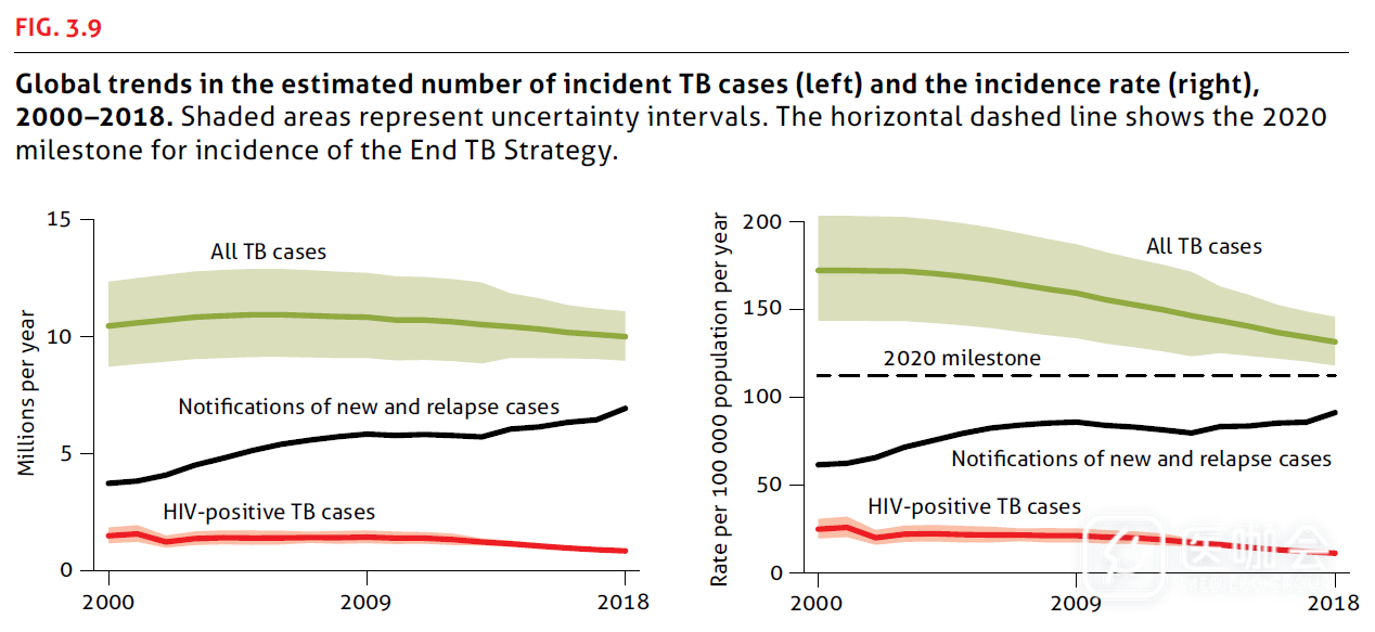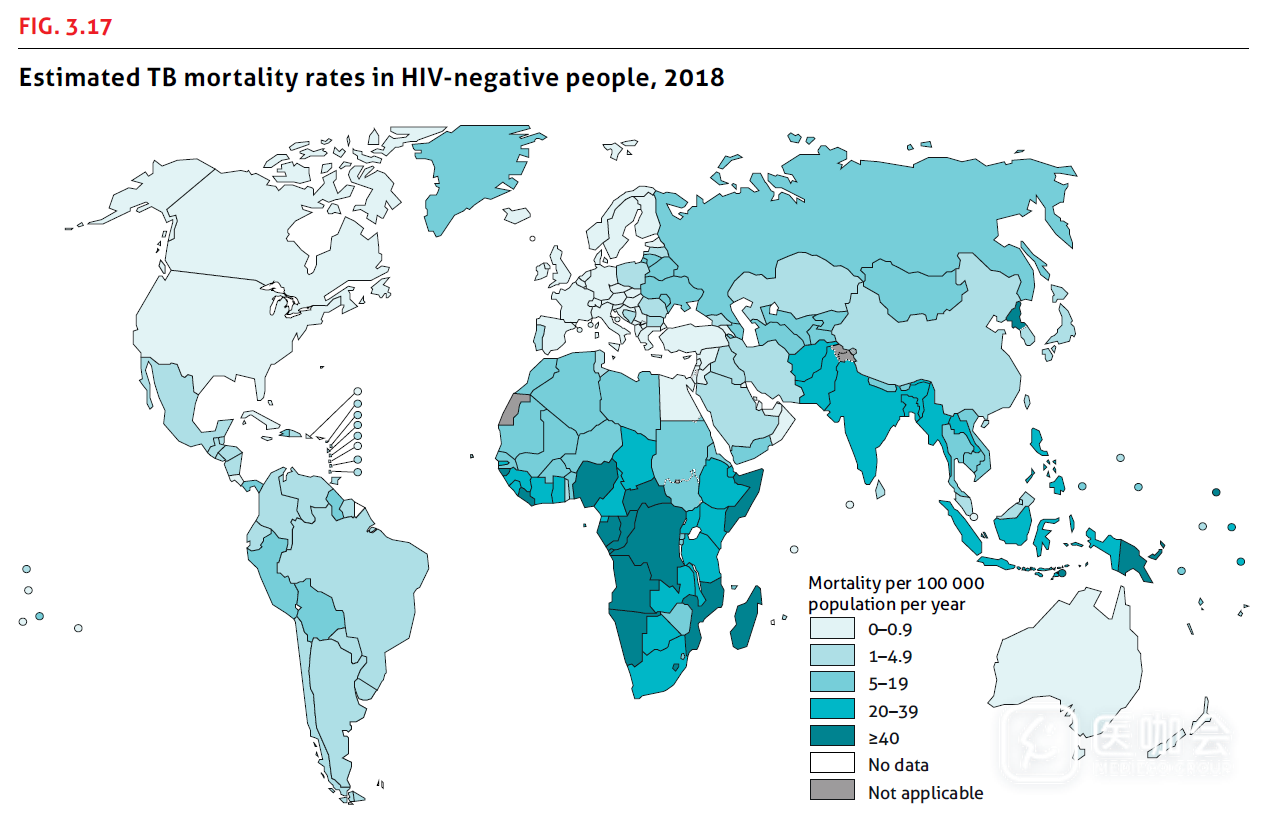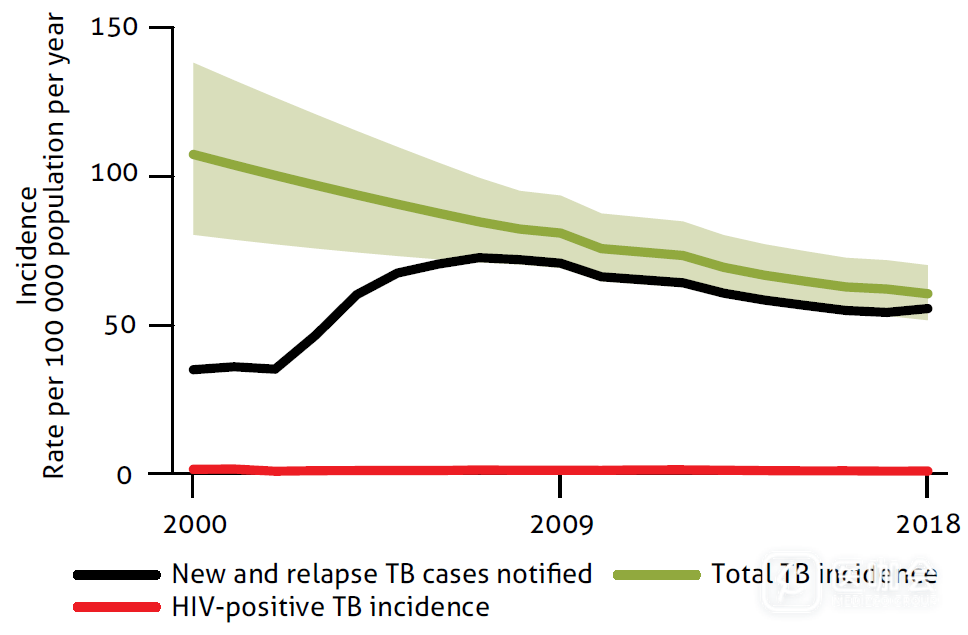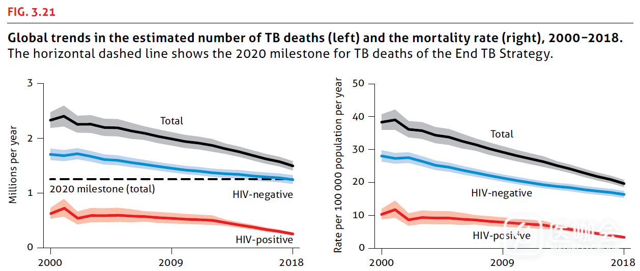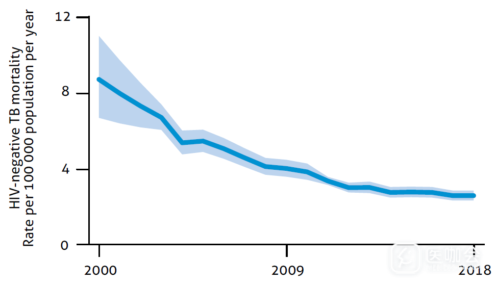 2018年,HIV阴性人群中,结核病导致约120万人死亡(相比2000年的170万,下降了27%);在HIV阳性人群中,也有25.1万人死于结核(相比2000年的62万,下降了60%)。