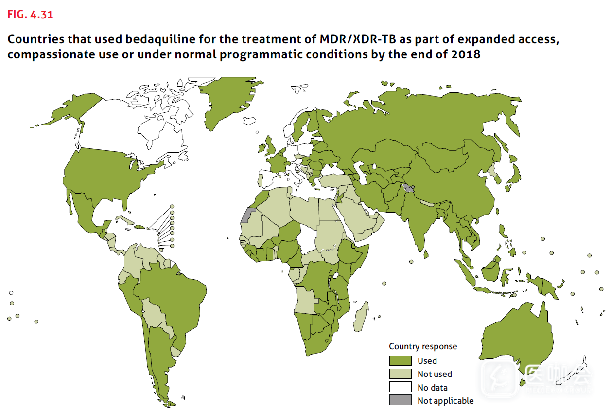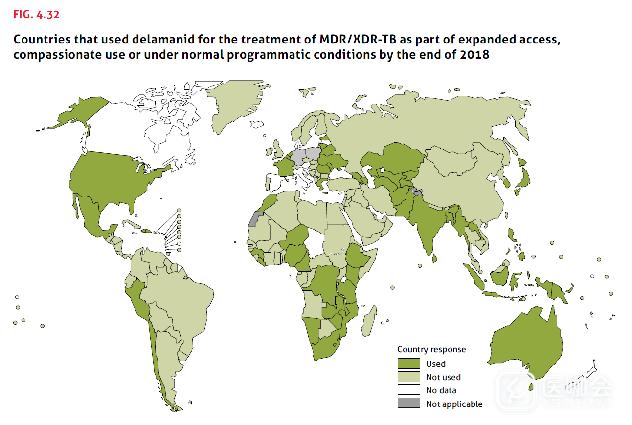 全球范围内,2018年共有186772名MDR/RR-TB病例被检测出并上报,比2017年的160684例有所增加。其中,有156071名患者参与了二线方案的治疗。但相比估计出的48.4万新发MDR/RR-TB病例,治疗率仅为32%。