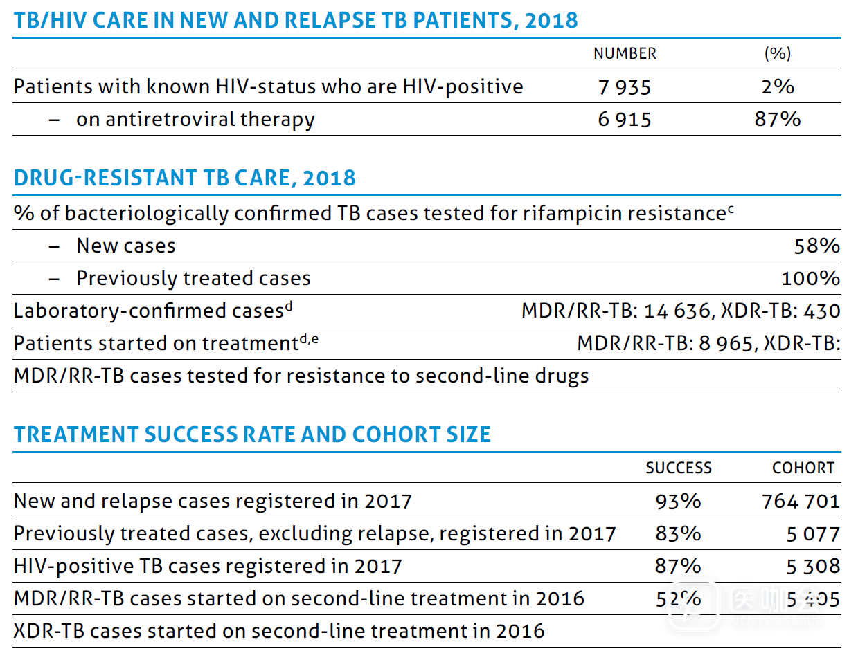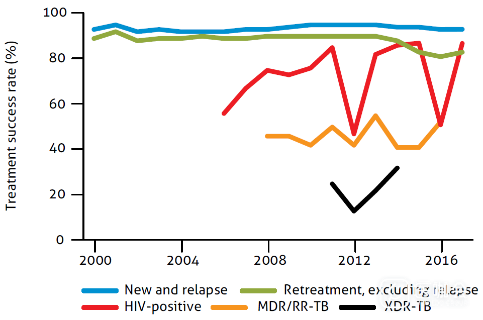 最近的治疗结局数据显示,结核的治疗成功率为85%,伴HIV的结核患者为75%,MDR/RR-TB患者为56%,广泛耐药结核患者为39%。