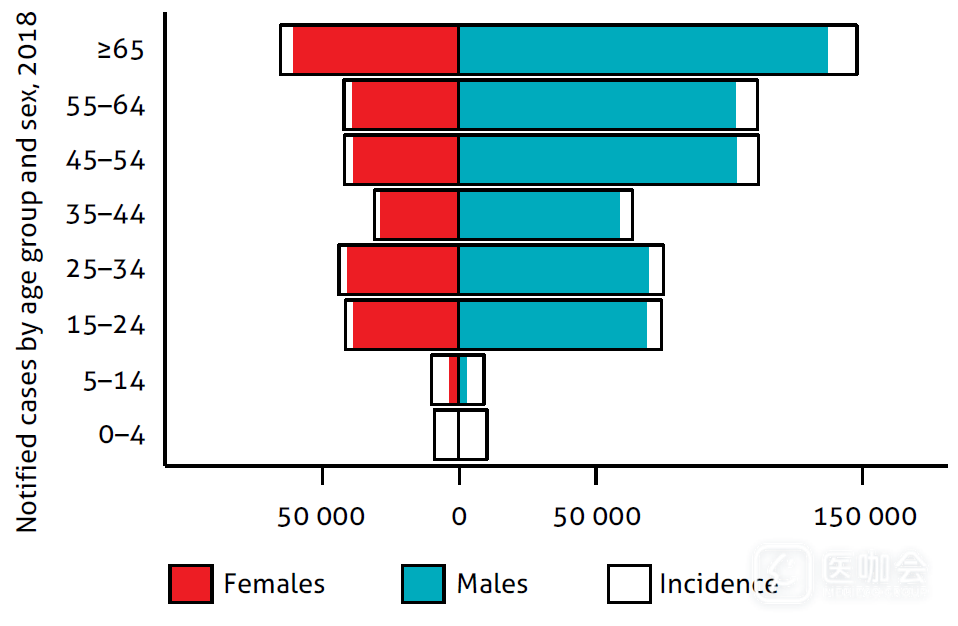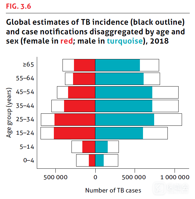 结核病负担最大的人群是成年男性,2018年,57%结核患者为这一群体;成年女性占比32%,儿童占比11%。所有结核病例中,8.6%的患者伴有HIV感染。