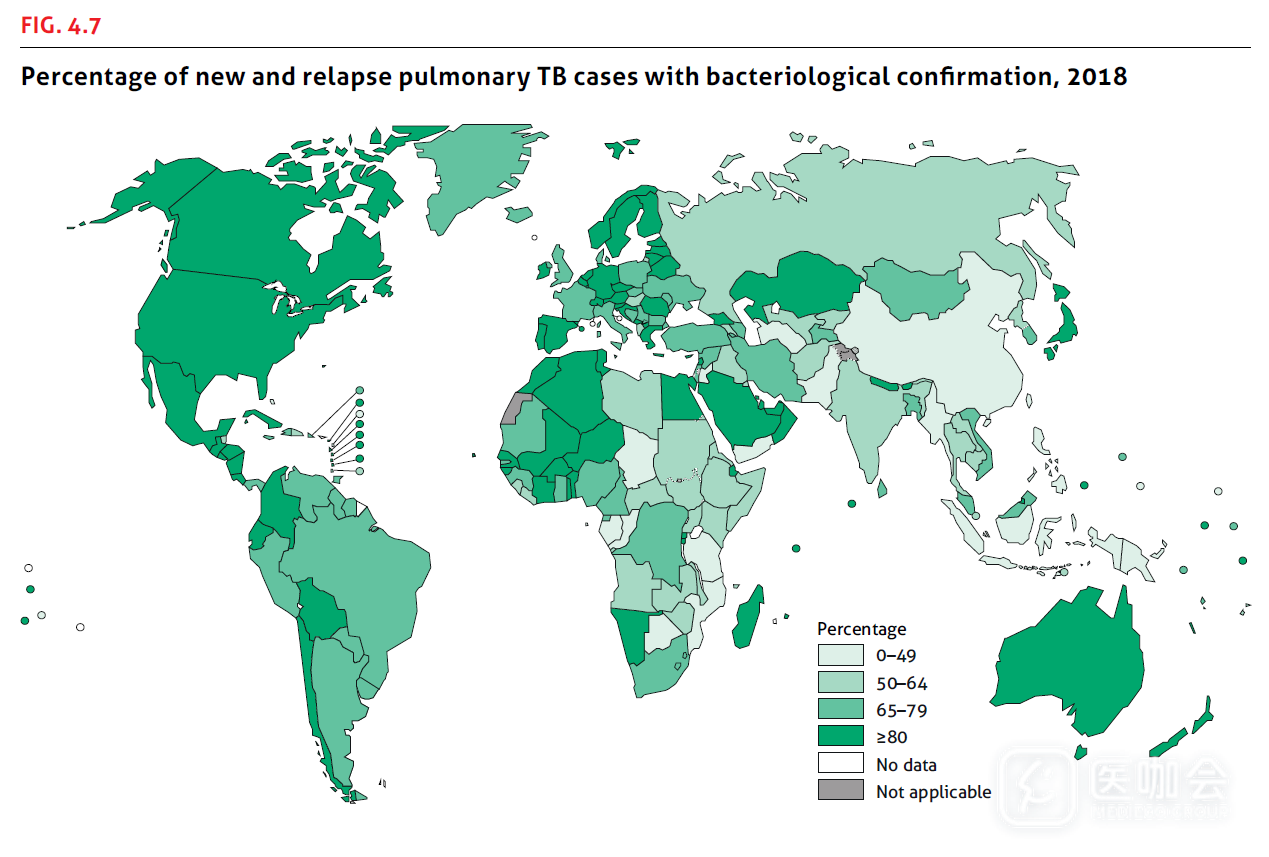 2018年,全球范围内,结核治疗覆盖率为69%,比2017年的64%和2010年的53%有所增加。55%的肺结核是通过细菌学检查确诊;细菌学检查确诊的肺结核中,51%进行了利福平耐药检测,相比2017年的41%有所增加。
