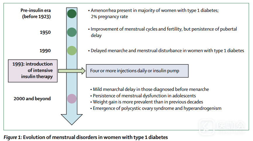 对于1型糖尿病,既往研究显示:相比非1型糖尿病妇女,1型糖尿病患者发生月经失调的比例要高的多。事实上,在胰岛素引入治疗之前,在1型糖尿病患者中,原发性/继发性闭经,不孕不育,青春期发育缺失等现象非常常见。