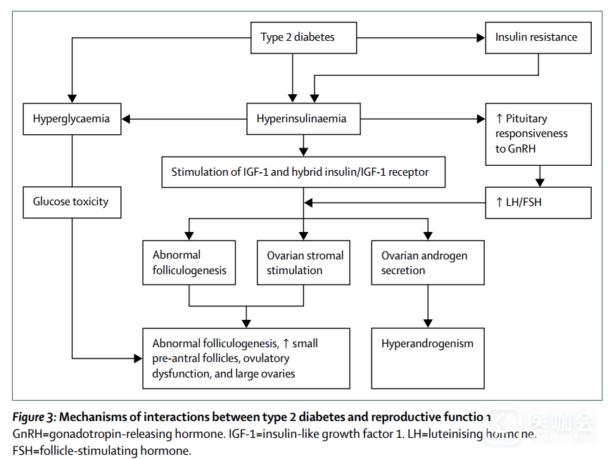 对于2型糖尿病,由于内源性胰岛素抵抗和高胰岛素血症,可通过刺激卵巢颗粒细胞,引起卵巢增大,并伴有大量小的生长卵泡,这是2型糖尿病中多囊卵巢形态增加的原因。胰岛素抵抗也可以通过阻止大的优势卵泡的招募影响排卵。