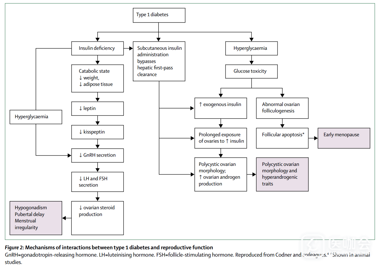 研究中小鼠表现为:无法控制的高血糖,代谢分解状态,脂肪质量减少,血清瘦素浓度降低。胰岛素和瘦素缺乏可抑制中枢神经系统Kispeptin的表达,而Kisspeptin是GnRH的一个重要刺激。在没有胰岛素的情况下,外源性给予Kispeptin可以逆转性腺功能减退。有人提出1型糖尿病妇女性腺功能减退机制可能包括:高血糖对下丘脑分泌GnRH的抑制作用(图2),但相关研究较少。除Kisspeptin外,中枢神经系统介质的变化也可能在GnRH分泌减少中起作用。不管机制如何,代谢异常似乎对生殖功能有有害影响。继发性性腺功能低下,引起的雌激素缺失,可能引起1型糖尿病女性相关并发症。而且1型糖尿病患者心血管疾病和骨量减少的发生相对较早,继发性性腺功能低下所致的雌激素缺乏支持这一结果。因此,为了减少长期并发症,1型糖尿病需要通过直接和间接(通过生殖功能)的方法来获得最佳血糖控制。糖尿病、胰岛素与卵巢病理学胰岛素,胰岛素抵抗和高血糖都可能导致1型/2型糖尿病患者的卵巢功能障碍。在卵巢的多个部个部位均可以表达胰岛素受体,胰岛素与胰岛素受体,以及卵巢胰岛素样生长因子1(IGF-1)受体结合,模拟FSH和LH刺激卵巢,其作用称为协同促性腺激素。