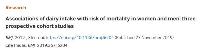 本次要介绍的这项最新发表在BMJ上的研究,纳入了三个大型队列,对乳制品总摄入量、乳制品亚型与总死亡率、死因别死亡率的相关性进行了研究。三个大型队列为护士健康研究(Nursing Health Study,NHS),护士健康研究II(NHSII)和卫生专业人员随访研究(Health Professional Follow-up Study,HPFS)。