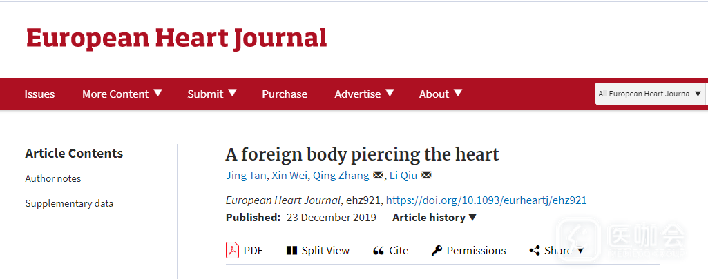 参考文献:A foreign body piercing the heart,European Heart Journal,23 December 2019