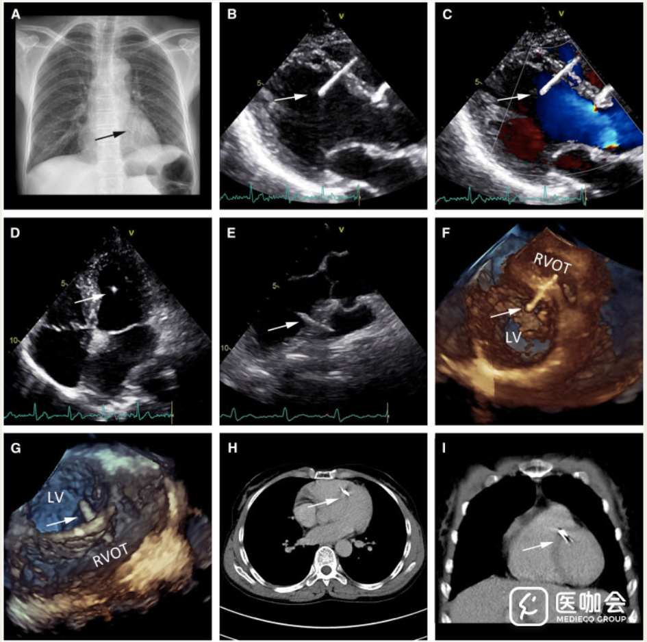 患者,女,55岁,因阵发性右上腹痛就诊,被诊断为胆结石。术前胸片显示心脏有致密条状阴影(下图A)。经胸和食管超声心动图证实致密条状阴影是异物(27毫米长),从右上到左下穿透室间隔,无室间分流。非增强CT显示在右心室和左心室以及室间隔(下图H和I)有异物。