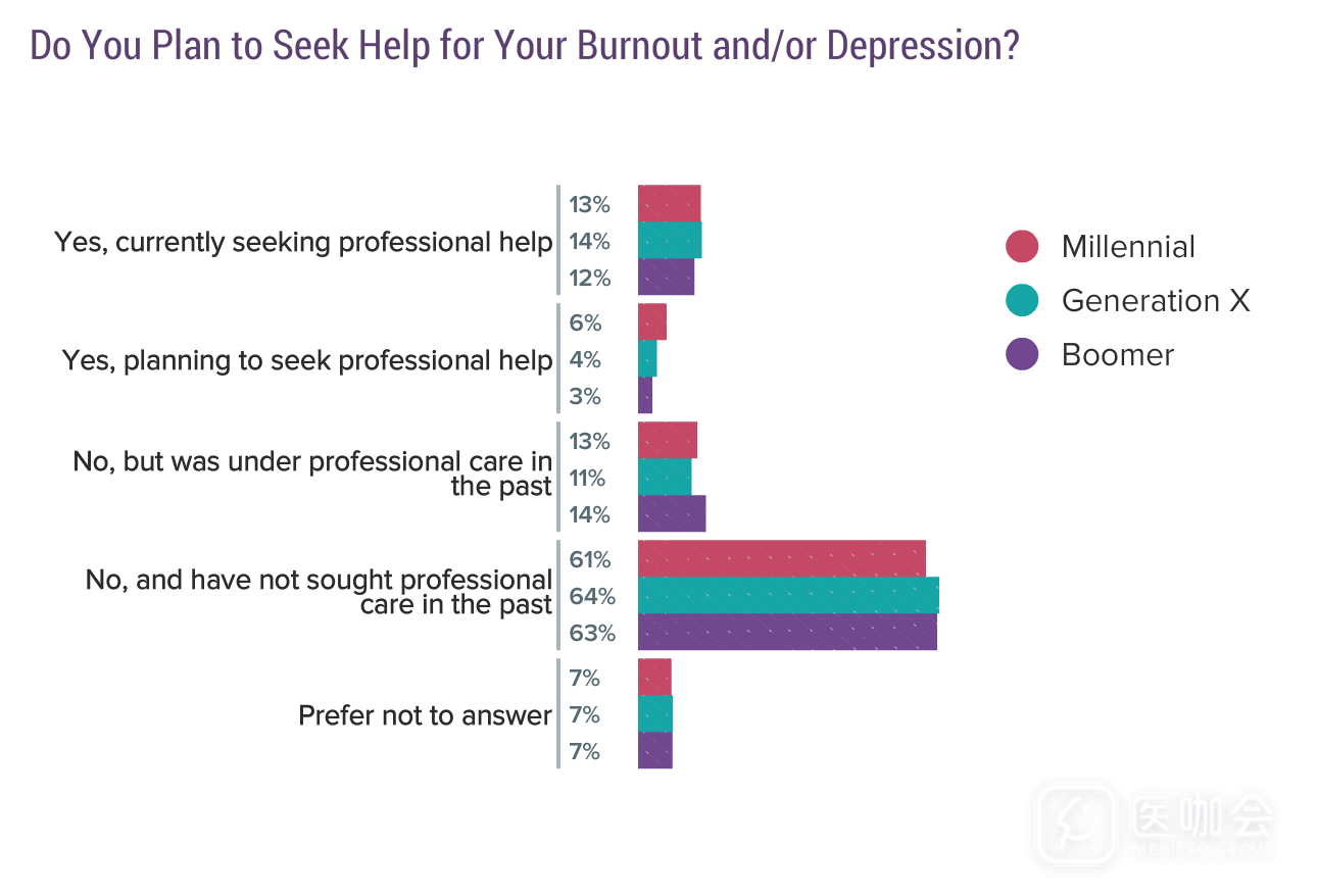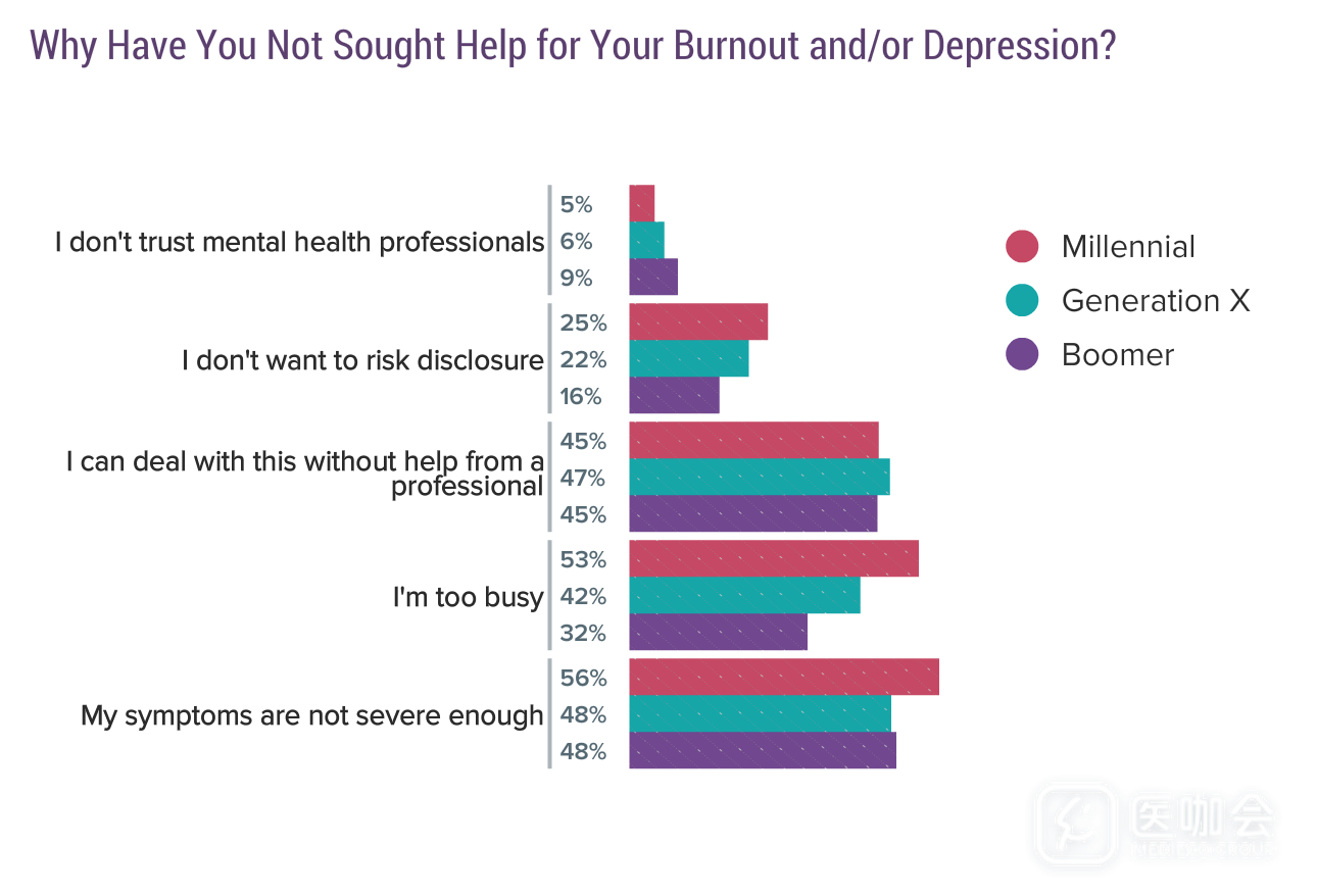一半医生表示他们的情况并不足以严重到需要寻求专业的帮助,其他医生则认为他们自己可以解决或工作太忙没办法寻求帮助。