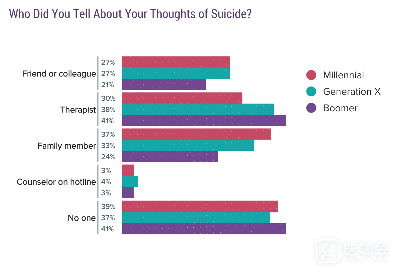 大部分抑郁医生并没有跟任何人提起过自杀想法。比起家人和朋友,老年医生更有可能对心理医生倾诉,青年医生和中年医生更可能对朋友、同事或家人倾诉。