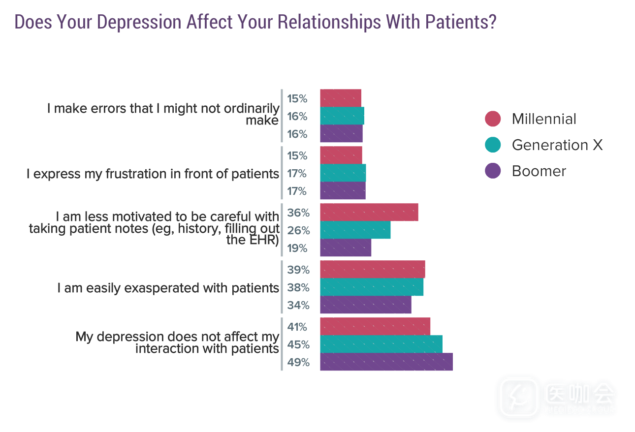 接近一半医生认为抑郁并没有影响到和患者的关系,然而,还有一半医生认为抑郁在某些方面造成了影响。超过1/3的青年医生认为抑郁影响了他们的诊疗积极性和仔细程度。