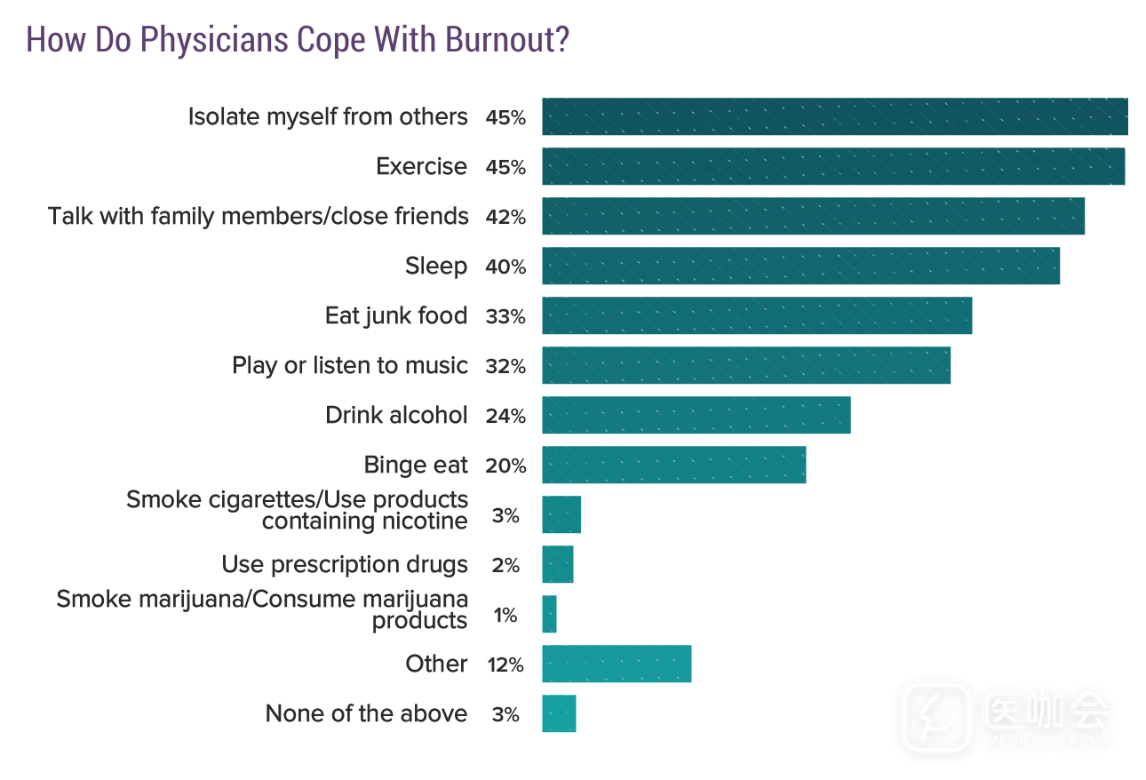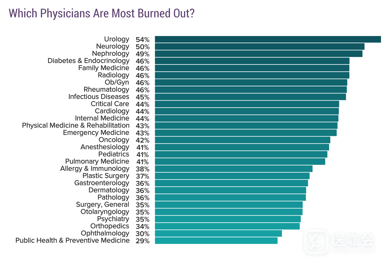 今年的调查结果显示,有42%的医生认为自己有职业倦怠问题,比5年前(46%)有所下降。过去5年内职业倦怠最严重的专科医生为危重症、急诊、家庭医生、普通内科、神经科和泌尿科医生。