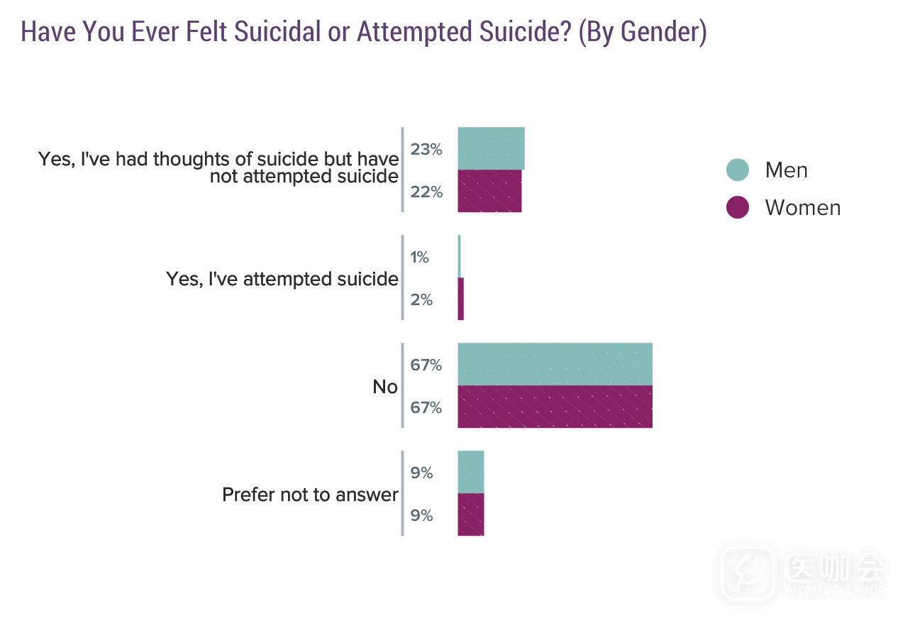 大部分存在抑郁问题的医生说他们并没有过自杀倾向,但还是有1%的医生尝试过自杀。男性和女性医生的比例没有差异。