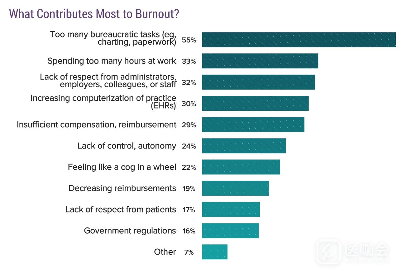 调查显示,工作时间长、工作负担过重和缺少支持是医生职业倦怠的最主要原因。这些原因在过去的几年内并没有改善。