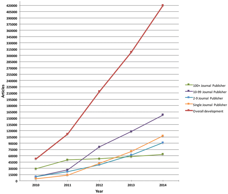 开放获取出版商Hindawi的Matt Hodgkinson说,这个结果并不令人惊讶,没有多少研究者认为掠夺性的期刊论文被高度引用了,但他还说,这项研究的范围很小。他说:“考虑到掠夺性期刊上文章数量,250篇的样本量是很低的。”每年都有成千上万的论文发表在掠夺性期刊上。例如,在2015年的一项研究[3]发现,这类期刊的论文发表量从2010年的5.3万篇增加到了2014年的约42万篇(下图)。