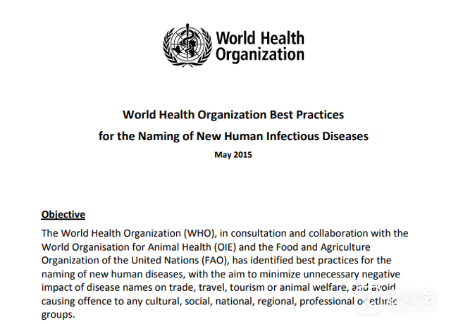 2015年,世卫组织发布了命名新型人类传染病的指导原则,要求名称中不能包含以下信息: