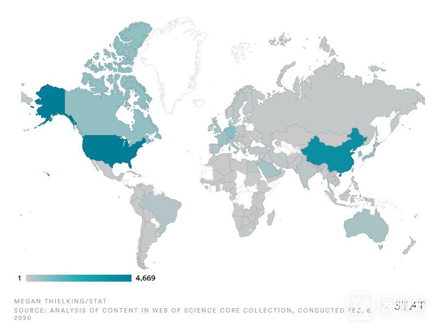 2002-2020年间,三分之一的冠状病毒研究论文来自美国研究者,还有四分之一来自中国研究者。