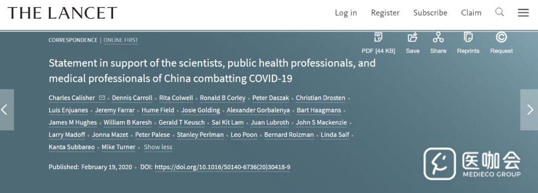 2020年2月19日,柳叶刀在线发表了来自8个国家27名知名科学家的声明“Statement in support of the scientists, public health professionals, and medical professionals of China combatting COVID-19(支持中国抗击2019年新型冠状病毒疾病(COVID-19)疫情中的科研、公共卫生、医务工作者的声明)”。