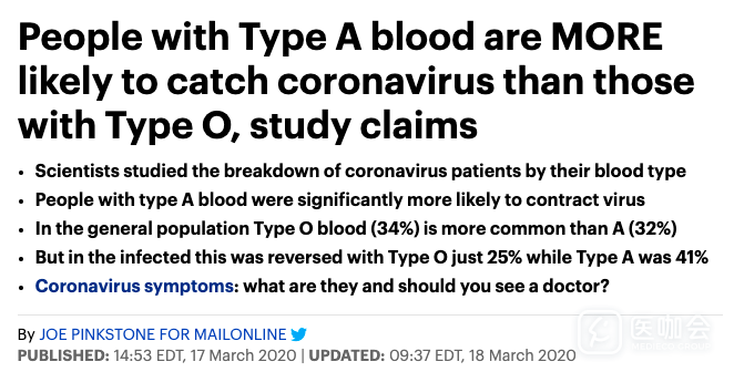 Daily Mail:研究称,A型血的人比O型血的人可能更容易感染冠状病毒