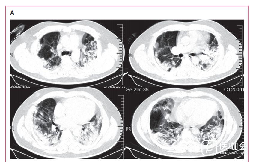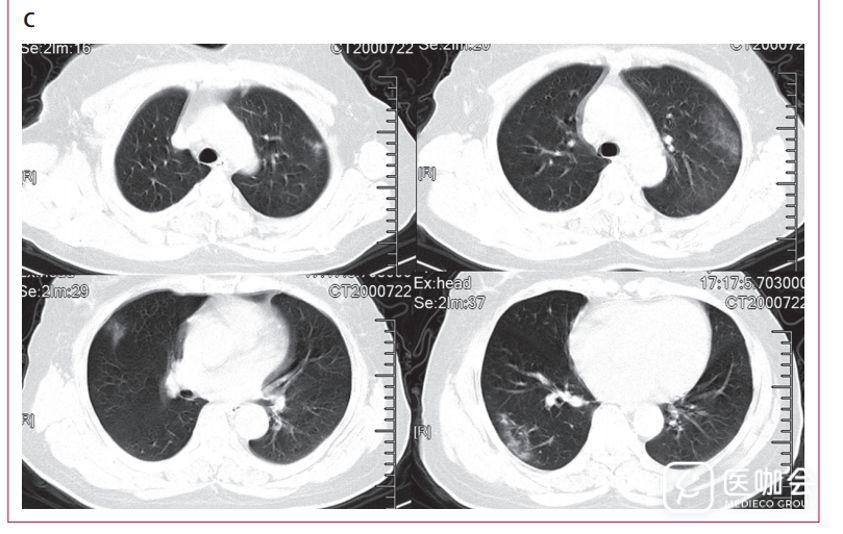 A是在症状开始15天时,一位年龄40岁男性胸部横面CT显示双侧多小叶及亚段实变区。