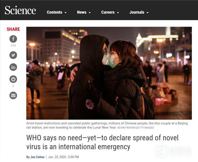 Science发表了一篇新闻:WHO says no need—yet—to declare spread of novel virus is an international emergency (WHO表明——暂不将新型病毒列为全球性紧急情况)。