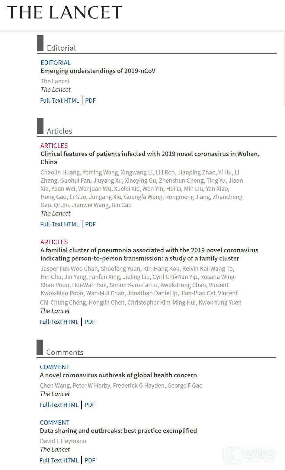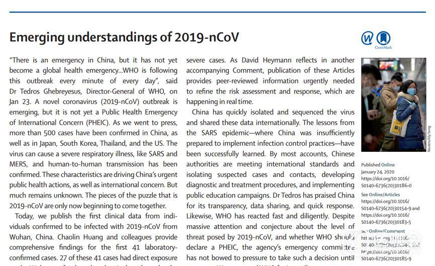 2020年1月24日, Lancet发表了关于新型冠状病毒的系列专题,共包括5篇文章,其中article有2篇,一篇是关于武汉新型冠状病毒感染病人的临床特征,另一篇是关于家族性聚集发病的报道(一个家族6位病人的流行病学、临床、实验室、影像学和微生物学结果);另外3篇是comments和editorial,题目大意是:“新型冠状病毒带来的全球卫生关注”、“数据分享与疾病爆发:最好的实践”、“对2019新型冠状病毒深入了解”。