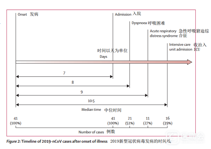 下图2展示了新型冠状病毒病人发病的时间线,从发病、入院、一些重要症状的发生、到收治于ICU的中位天数。