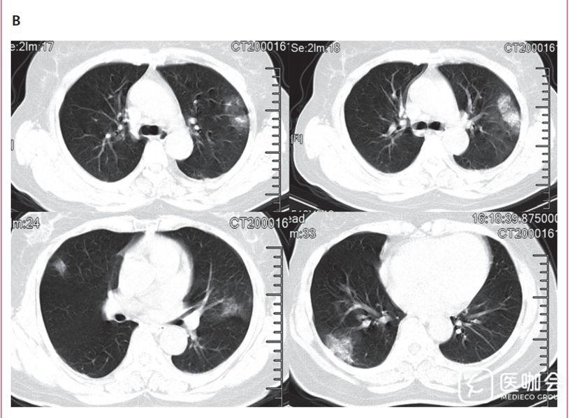 B是在症状开始8天时,一位年龄53岁的女性胸部横面CT显示双侧磨玻璃状样变和亚段实变区。