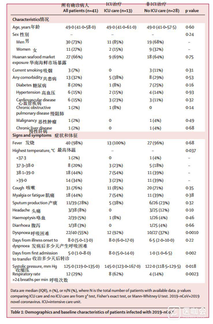 下表1展示了感染新型冠状病毒病人的人口学特征和基线特征。总数41人,亚组分别是ICU治疗和非ICU治疗。列出了各种特征的绝对数量和所占比例。可以看到发烧的比例至少96%。