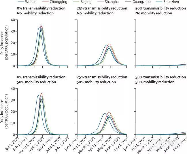 研究人员估计,如果病毒传染性不降低,2019-nCoV疫情将在2020年4月左右达到高峰,中国大陆各城市的局部疫情将滞后1-2周。如果国内所有城市的传播率都降低25%,那么当地疫情的增长速度和规模都将大幅下降,疫情高峰将推迟约1个月,规模将减少约50%。如果传播率降低50%,将使病毒R0减小到1.3,在这种情况下,疫情将会在2020年上半年缓慢增长,并不会出现高峰。