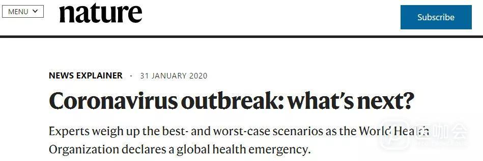 2020年1月31日,Nature期刊在线刊登新闻解说《Coronavirus outbreak: what’s next?》,就此次2019-nCoV病毒肺炎疫情所关注的问题,进行了阐述。