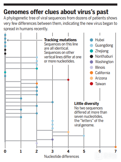 基因测序的数据尚不能证实传染源,但是数据显示病毒从动物到人类的传播是最近才发生的,Koopmans说道。一份关于最先30例公开发表的测序信息的分析表明,这些样本之间最多相差7个核苷酸(如下图所示)。根据这些核苷酸的差异和既定的变异速度,不同研究组计算出,病毒是从2019年11月中旬开始传播的——这个证据支持了这个论断:在海鲜市场接触相关病例产生前,病毒就发生了播散。有一个研究组甚至推算,病毒传播早在2019年9月18日左右就发生了。