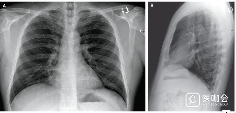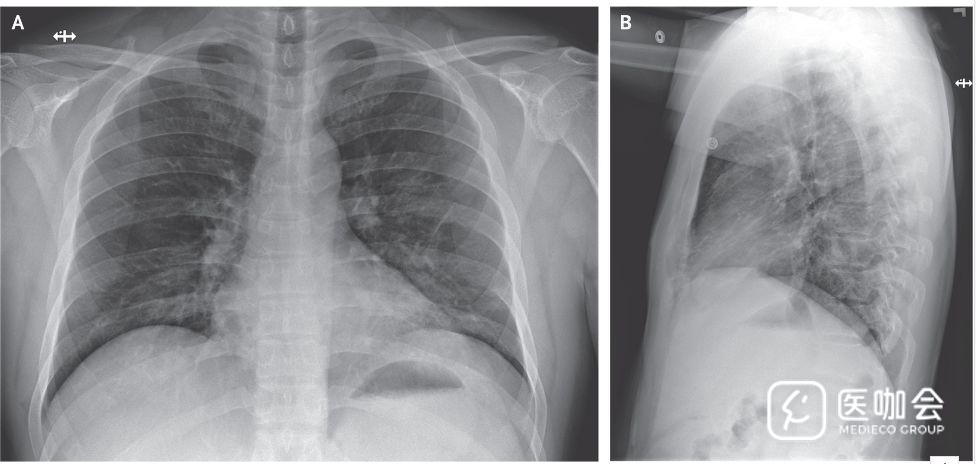 除了有高甘油三酯血症病史外,患者身体健康,且不吸烟。体格检查显示患者体温37.2°C,血压134/87mmHg,脉搏110次/分,呼吸频率16次/分,氧饱和度96%。肺部听诊显示干啰音,胸片无异常(图1)。