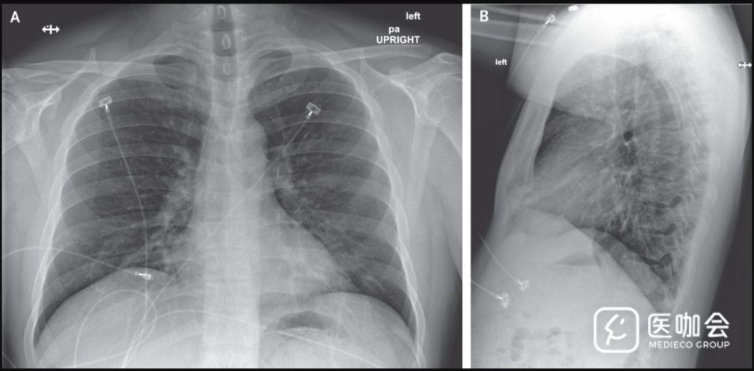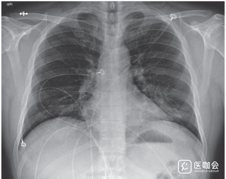 患者住院第3天(患病第7天)时,胸片仍未显示浸润或异常表现(图3)。但是,在住院第5天(患病第9天)晚上的胸片显示,左肺下叶有肺炎表现(图4)。
