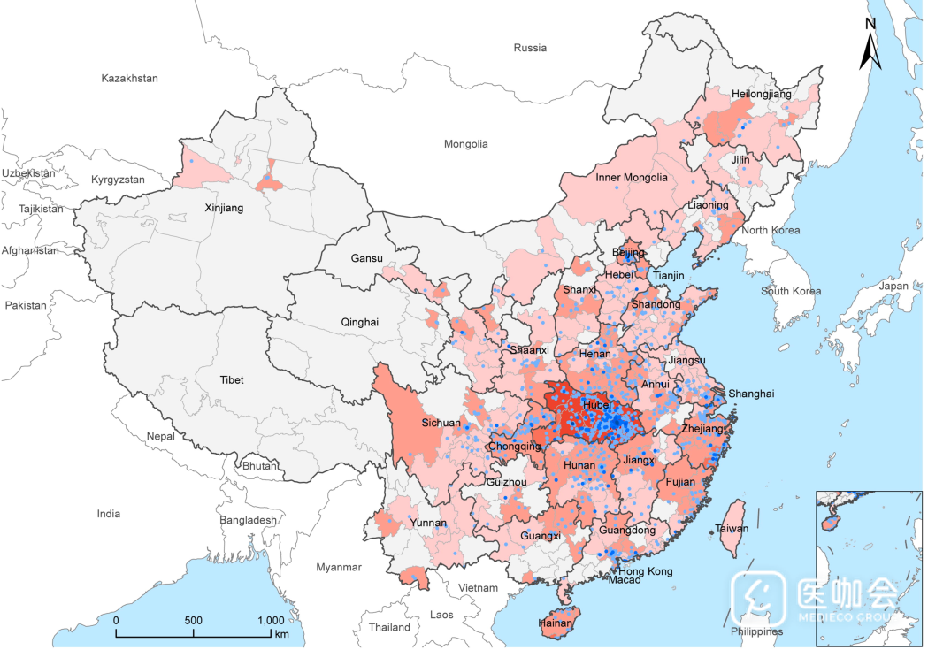 在乡镇层面上看,尤其在湖北省(占所有病例的65.35%),呈现明显地理性聚集,类似的聚集特征在邻近省份、北京、长三角、珠三角地区和香港也很明显。