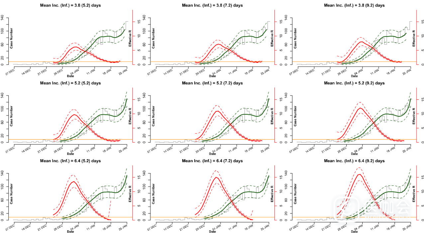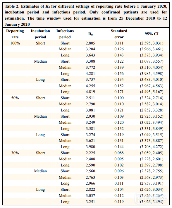 如果时间窗口从2019年12月25日至2020年1月12日移至2019年12月28日至2020年1月15日,根据确诊患者,R0估计值降至3.00(95% CI:2.81-3.20),根据所有患者的资料,R0估计值降至3.28(95% CI:3.14-3.43)。
