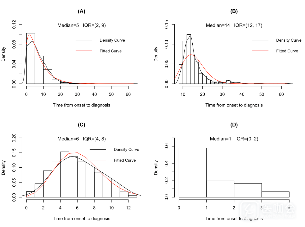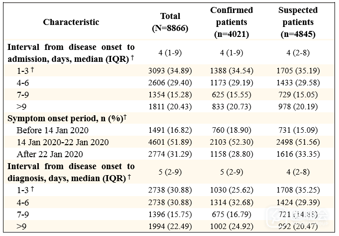 在确诊病人中,从出现症状到确诊的时间中位数为5天(2-9天)。从2020年1月14日到1月22日期间,确诊时间有明显的下降。