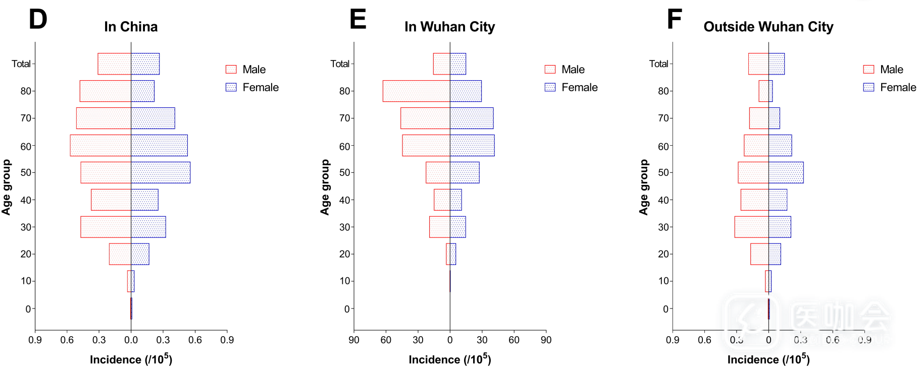 在≥50岁的成年人中观察到的发病率最高,而在20岁以下的年龄组中发病率最低。总体而言,男性的发病率要高于女性(0.31/10万 vs 0.27/10万,P<0.001),但武汉与其他地区的年龄-性别分布模式不同,武汉市外高发人群的年龄段比武汉发病人群的年龄偏低。
