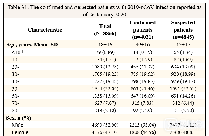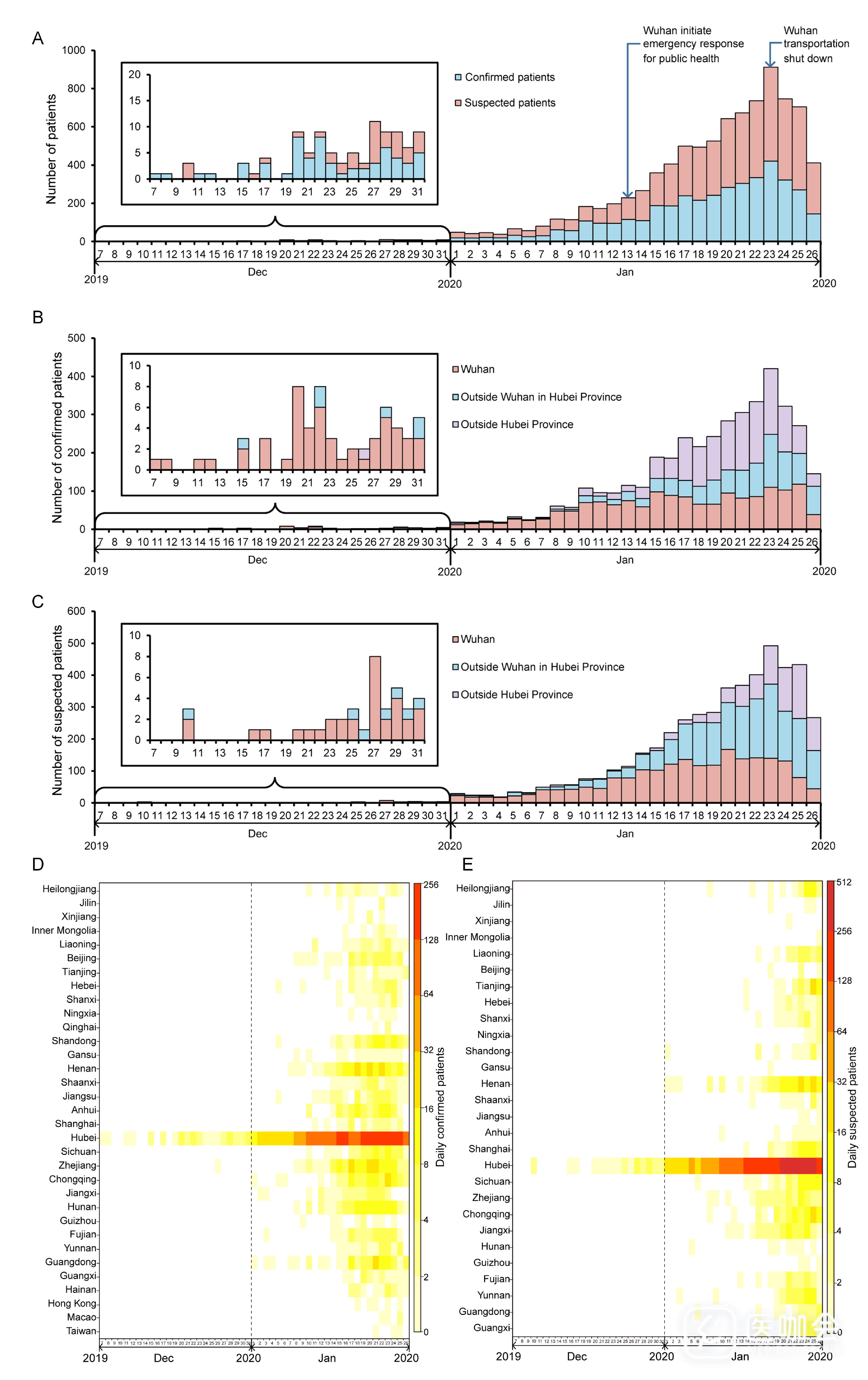 截止到2020年1月26日,来自中国30个省市共报告了8866例患者,其中4021例(45.35%)被实验室确诊为病毒核酸阳性。最早一批出现症状的确诊患者可追溯至2019年12月7日。