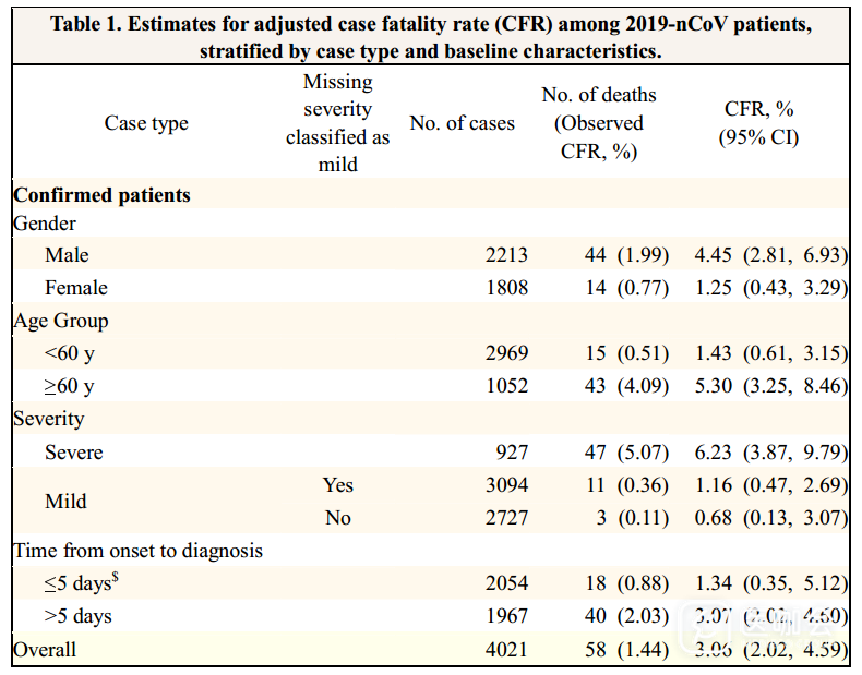 有58名确诊患者死亡,观察到的病死率为1.44%(95% CI:1.10-1.86%),重症肺炎患者的病死率为5.88%,显著高于轻症肺炎患者(0.12%)。研究人员估计确诊患者调整后总体的病死率为3.06%(95% CI:2.02-4.59%)。