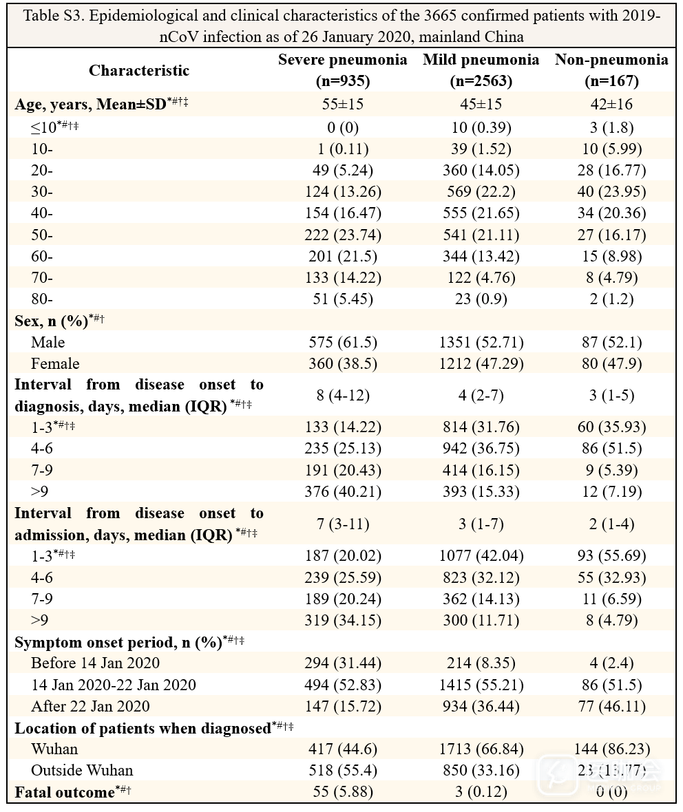 10、在确诊的患者中,重症肺炎患者的比例为25.5%,其年龄较大(55±15 vs 45±15),男性患者比例更高(61.5% vs 52.7%),从发病到确诊的中位时间更长(8 vs 4天)。
