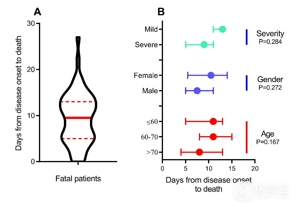 从发病到死亡的中位时间为9.5天(4.8-13天),各年龄段、性别、疾病程度之间相比,死亡天数的差异不大。