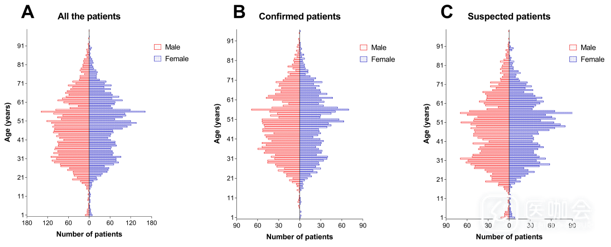 确诊病例以30-65岁的患者为主(2873例,71.45%),在疑似患者中也同样观察到类似的年龄分布特征。