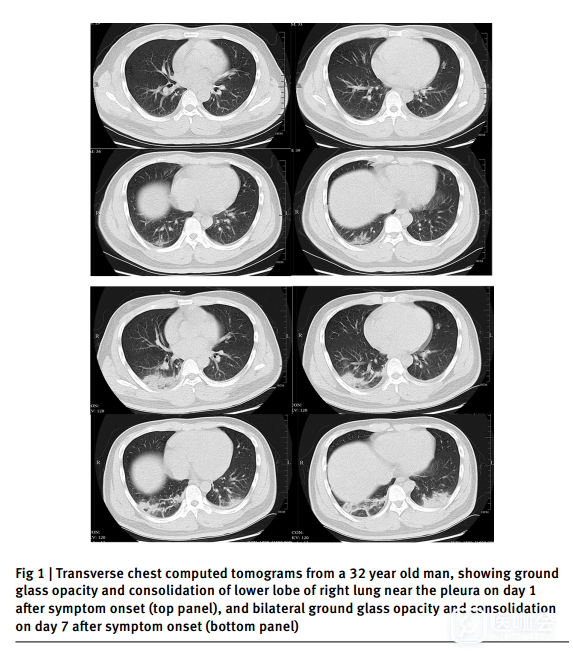 除1例患者外,其余患者的胸部CT或胸片均显示异常。52例(84%)患者的胸片显示肺部双侧受累(表2)。入院时感染患者的胸部CT典型表现为双侧多发小叶或亚节段实变或双侧磨玻璃影(图1)。只有一名患者没有出现肺炎相关症状。